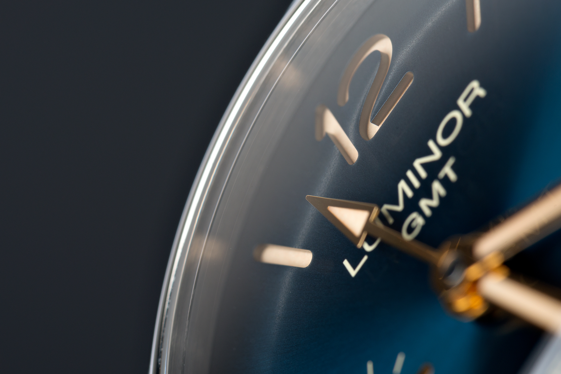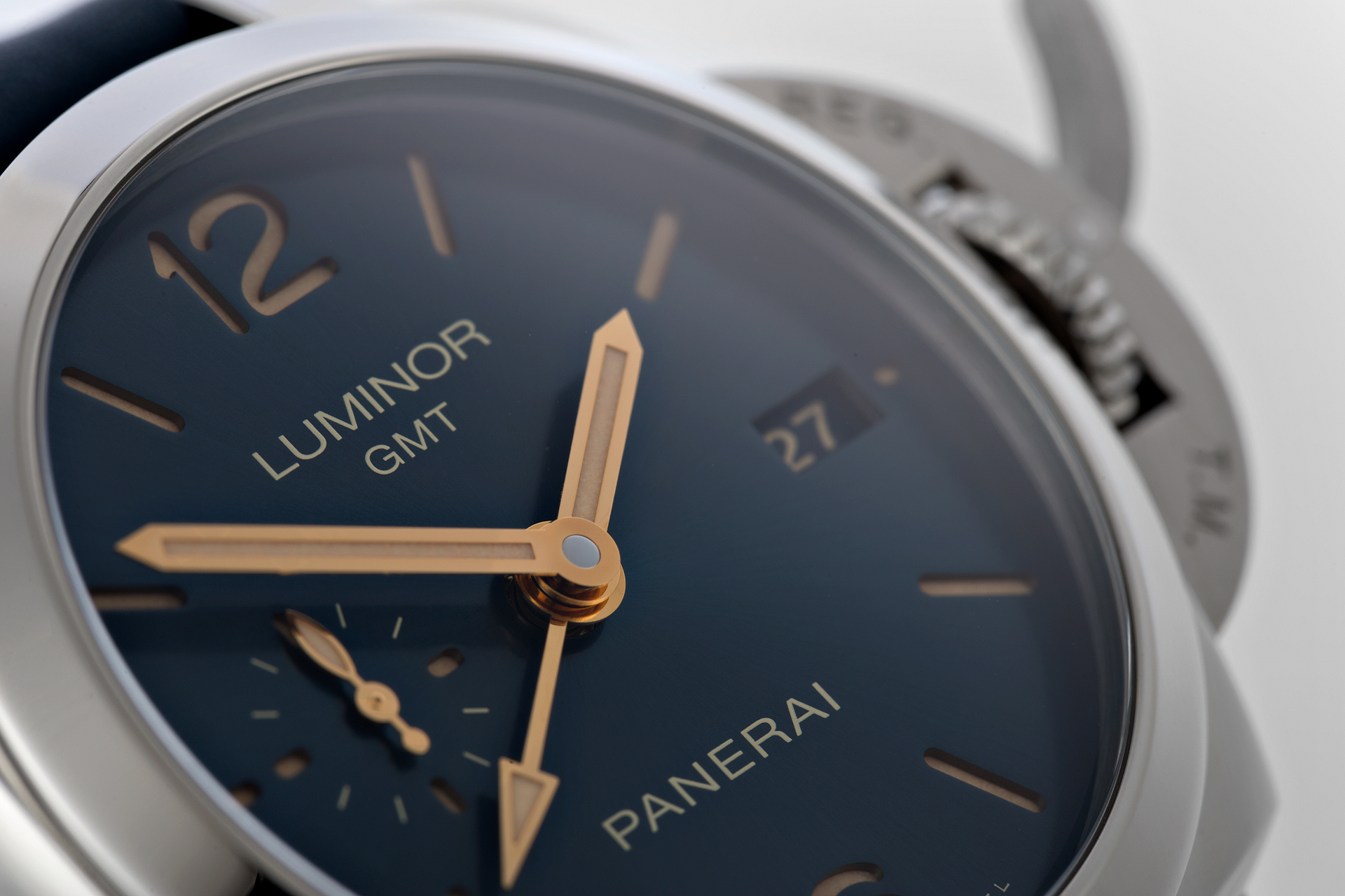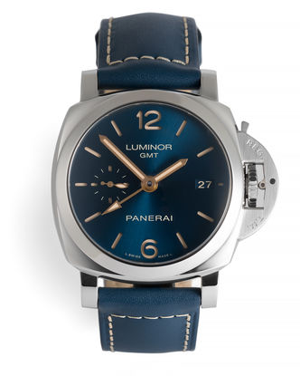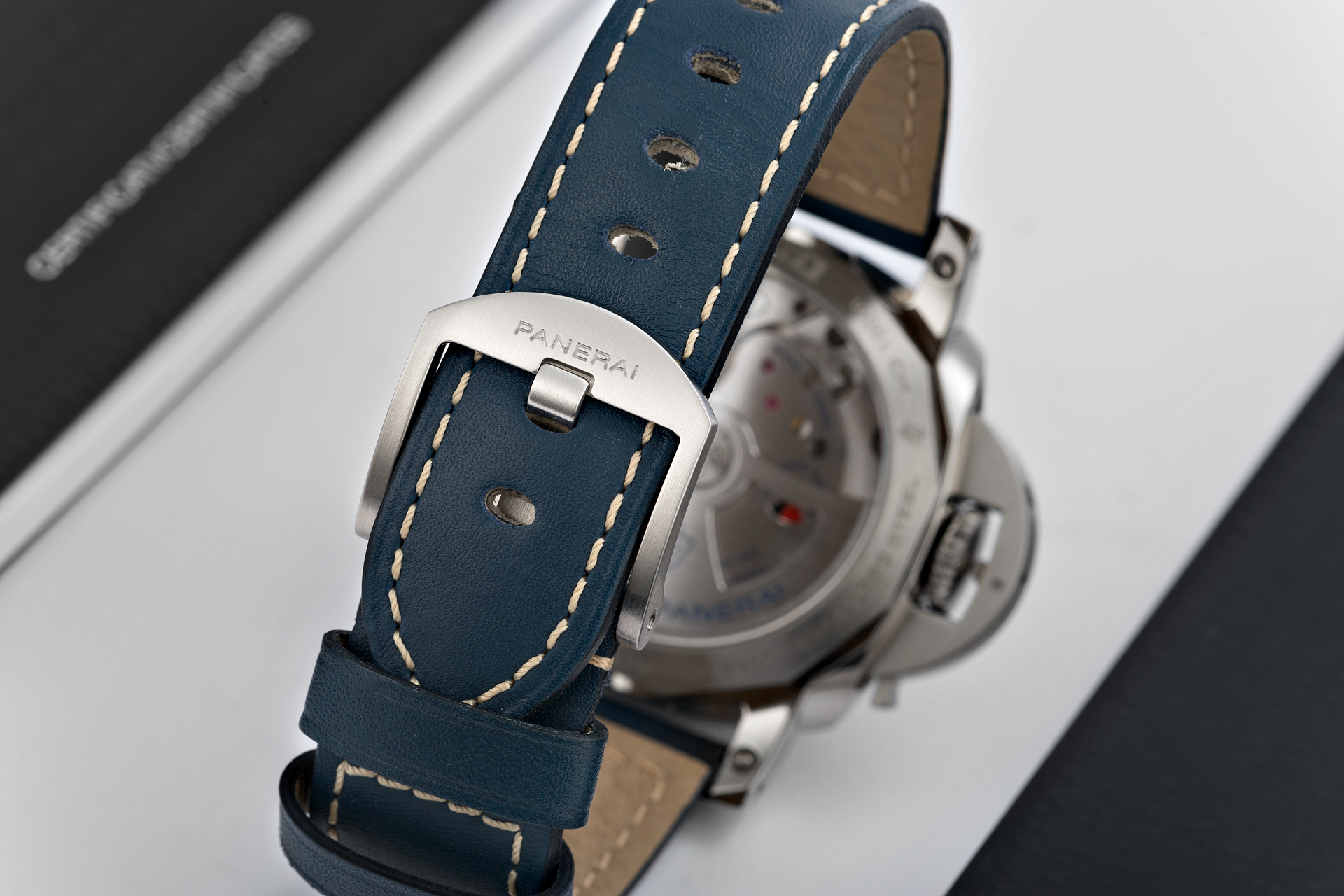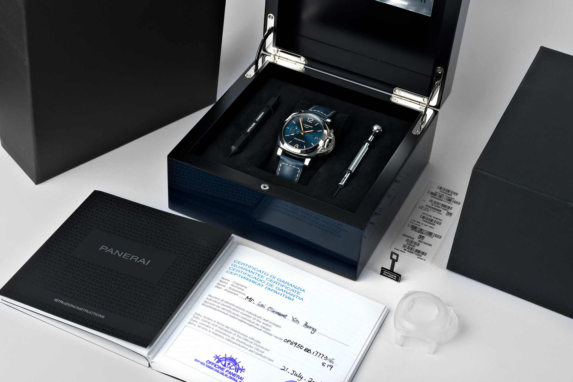 This 47mm Luminor 1950 3-Day GMT sports a very special blue sunburst dial. Complete with its original box, warranty certificate and booklets, this special edition houses the new P9001 calibre movement with 3 day power reserve and GMT feature.